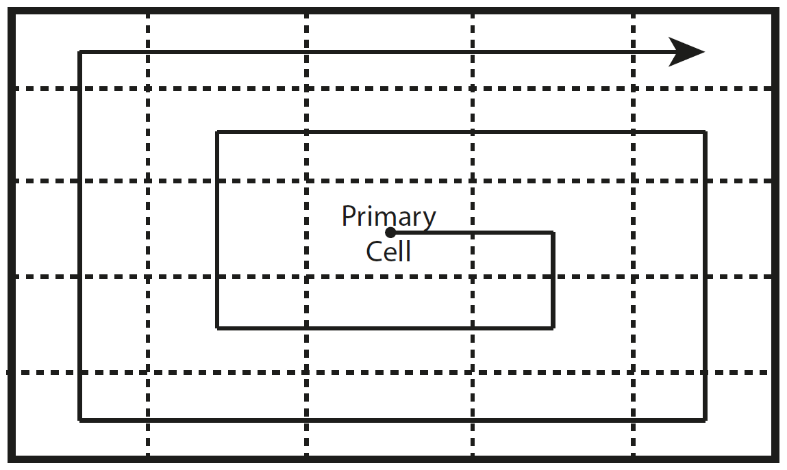 Imagine the following problem. You programmed a two-dimensional field that will be divided into sectors or cells. Now you want a pointer that starts from the center cell and walks through each cell in a spiral shape like this